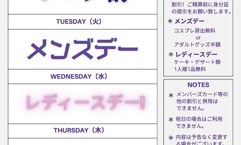 weekly plan 今日は何がおトク?知る人ぞ知る、曜日ごとの楽しみ発見! 日替わりでお得が変わります。 月曜日 シニア割 火曜日 メンズデー 水曜日 レディースデー 木曜日 シニア割 金曜日 お食事メニュー半額デー 曜日により特典が変わります。 ぜひお立ち寄りください。